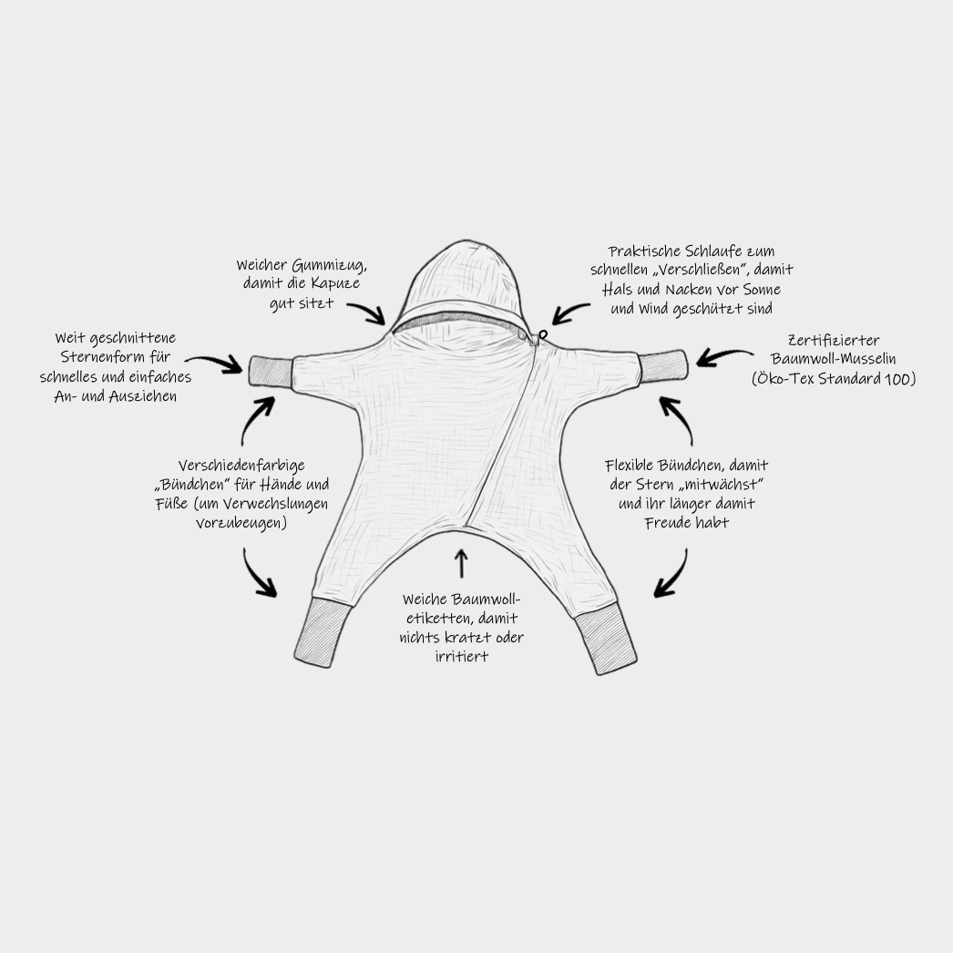 Könnyű és szellős, mégis biztonságos: Az ALIZITA nyári csillagoverál 100% pamut-duplagézből készül, amely légáteresztő, különösen puha és Öko-Tex Standard 100 tanúsítvánnyal rendelkezik, így tökéletes választás az érzékeny bababőrnek.